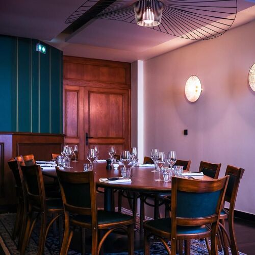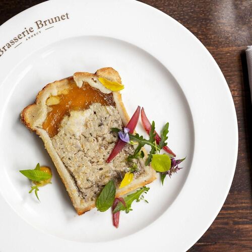 At this restaurant a stone's throw from the train station, you receive a warm welcome in a British-style decor with exposed stonework, wood panelling and moleskin-clad banquettes. "Brunet" pâté en croûte; black pudding with onions, apple and lamb's lettuce salad; calf's liver and spelt risotto – an avalanche of delicious dishes served in a relaxed atmosphere by a smiling team in black attire and leather aprons. A pleasant terrace for sunny days.