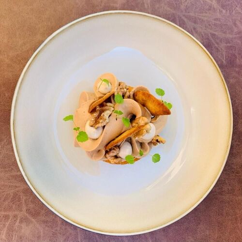 The roots of this bistro go back to the family history of the proprietors, a young couple: on one side of the family, a butcher's shop specialising in choice meats (especially milk-fed veal from the Limousin) and on the other, chickens and orchards. The chef, former second in command at L'Esquisse, knows all about good produce, as his dishes show: slow-cooked egg, crozets pasta, brezain cheese; onglet de veau (veal steak), polenta, grilled leek, garlic condiment.