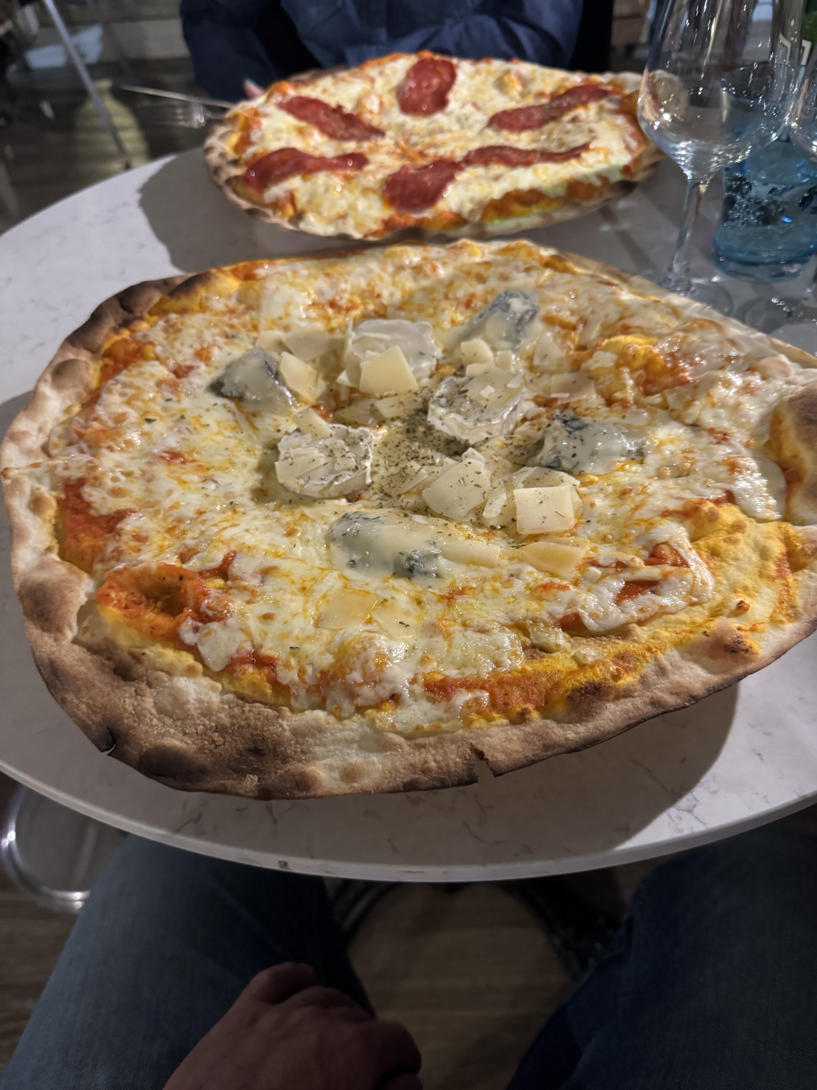 For me, this is the best pizza I've had in 50 years. Thin crispy crust that doesn't taste like cardboard or dry paper. Toppings on all 3 pizzas were plentiful and good gooey cheese. Yum. Will go back for more. Also, a wonderful bar and great cocktails.