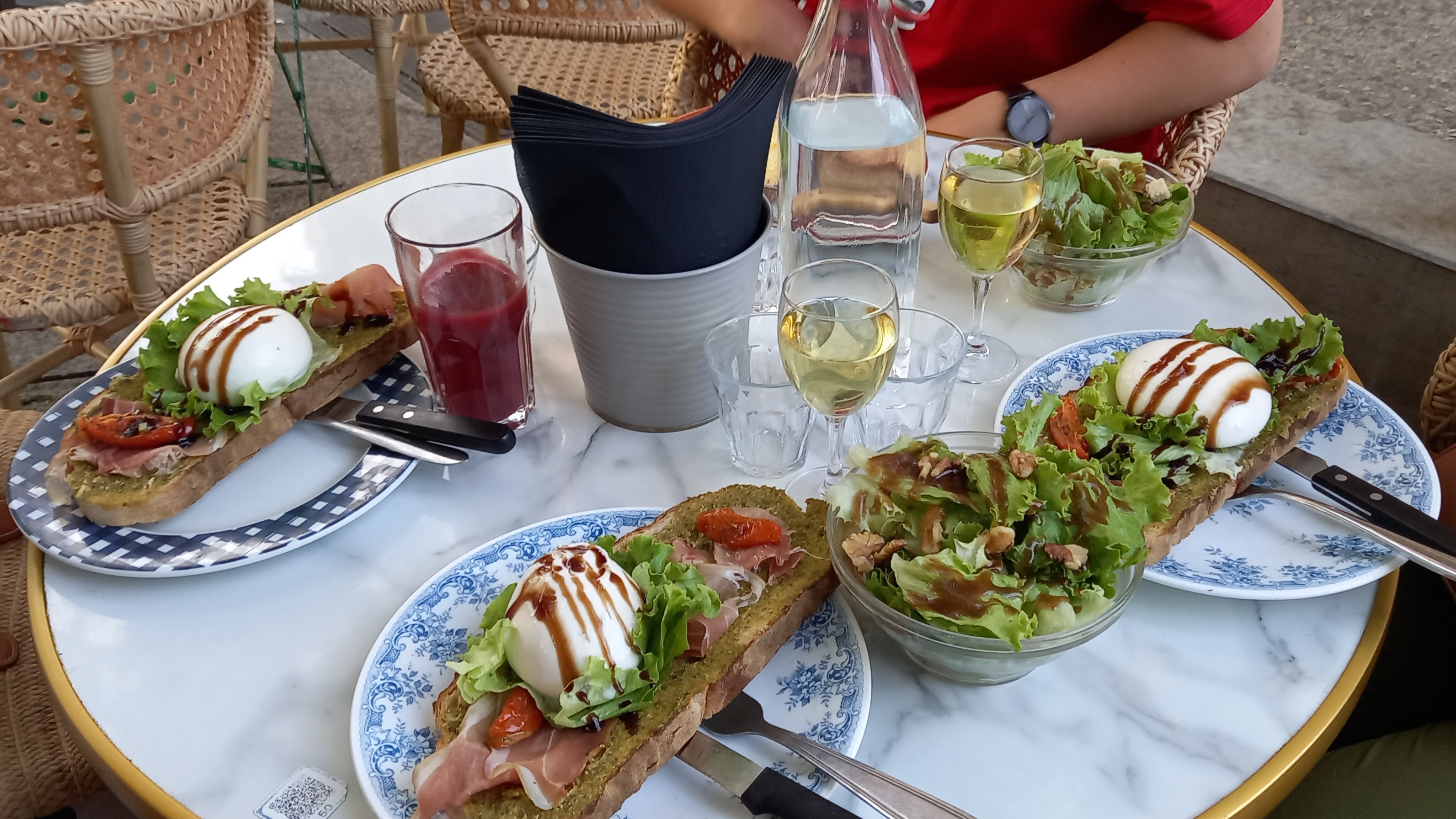 A lovely little lunchtime spot to eat. There was plenty of shade outside, lots of seats with parasols, all in a lovely square with a fountain in the middle. A simple menu with a variety of hot and cold open sandwiches, starters and some nice drinks options too. The waiting staff were polite and attentive, and the food arrived quickly. We particularly enjoyed the mixed starter with some tasty cheeses and crusty bread. The main course was great, my son enjoyed the anchovy open sandwich and my wife really liked the smoked salmon. It was all very tasty indeed!