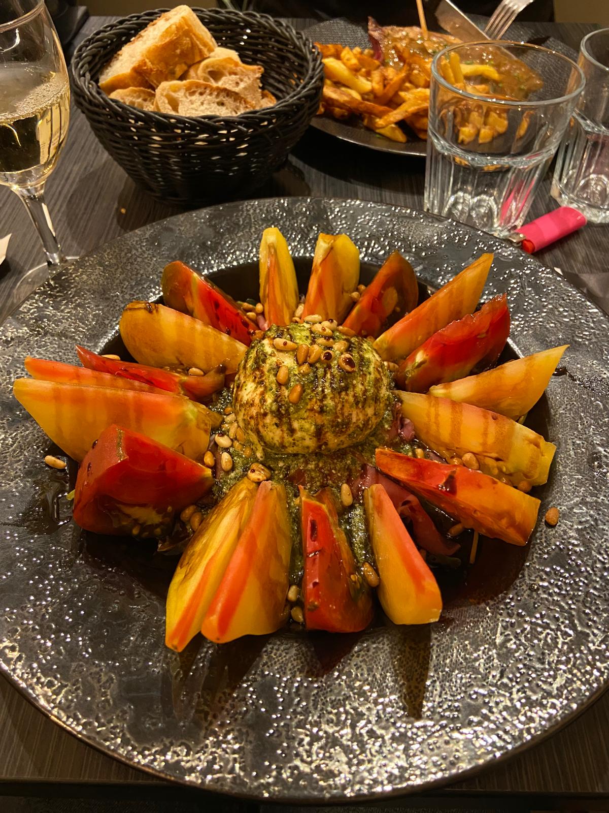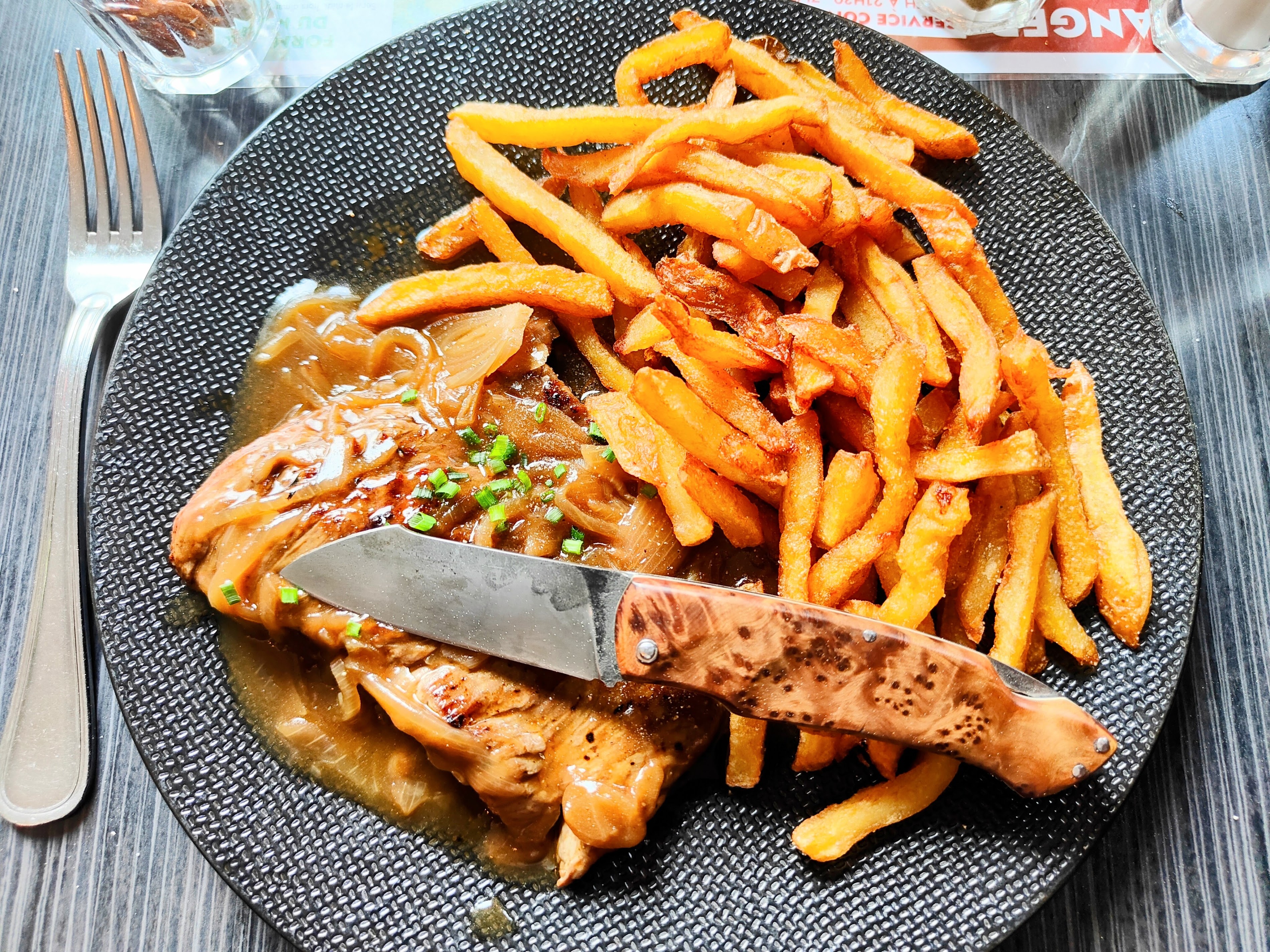 Really well situated restaurant, one street back from the main street so you can enjoy dinner in peace. Also prime spot in the evening sun, with their outdoor seating area. Very dog friendly, providing water bowls and cuddles (for the dog). We have fish and chips, which looked a tad overcooked but when we cut into the fish it was actually perfect (better than one Michelin start restaurant we are in last week). The batter was light and tasty and the fish was pure white and just flaky, delicious! We enjoyed a very nice bottle of Chablis and all up it was all very reasonably priced. If we had more time in Bayeux we'd be back!