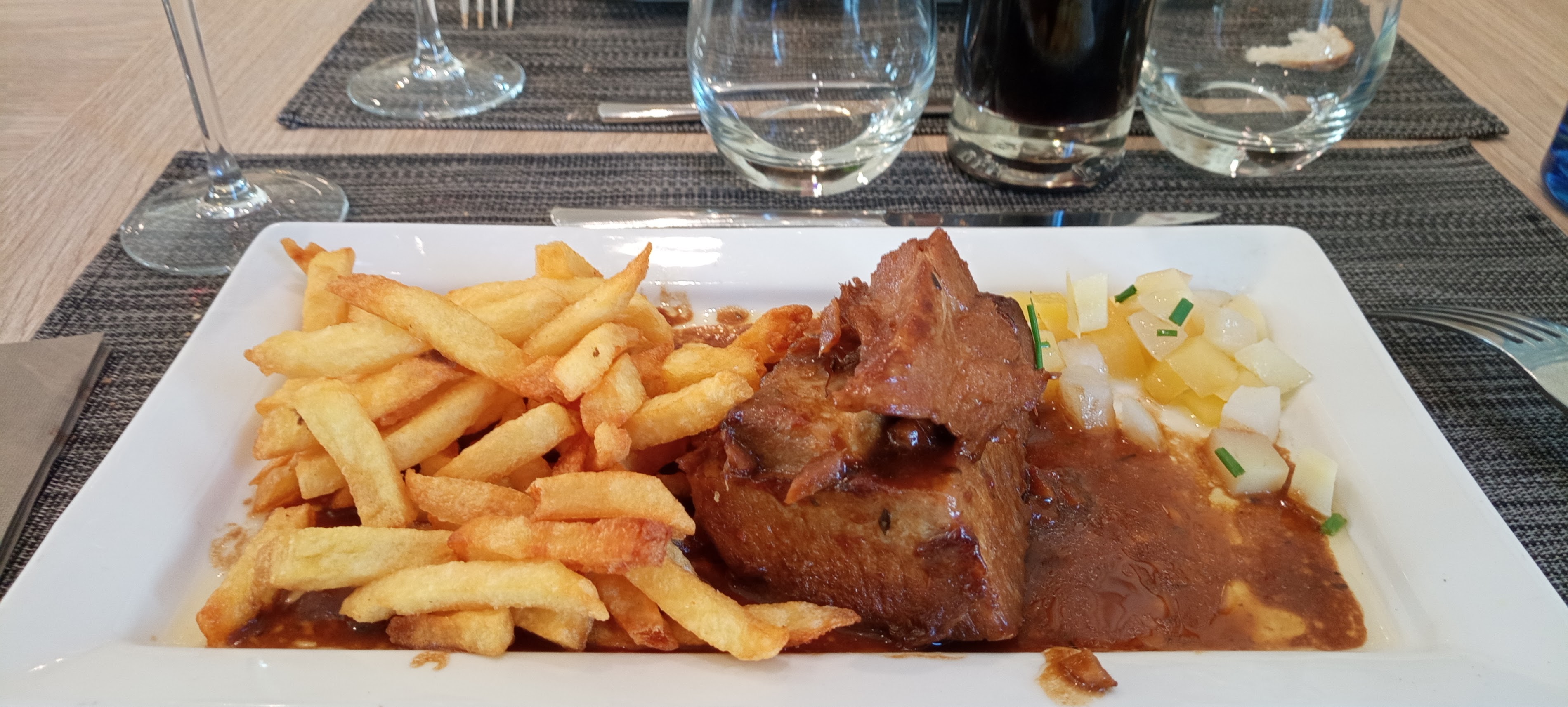 Very pretty restaurant ? which from the outside leaves us imagining a magnificent interior with exposed stones, spacious, quiet ? with a succulent meal ?