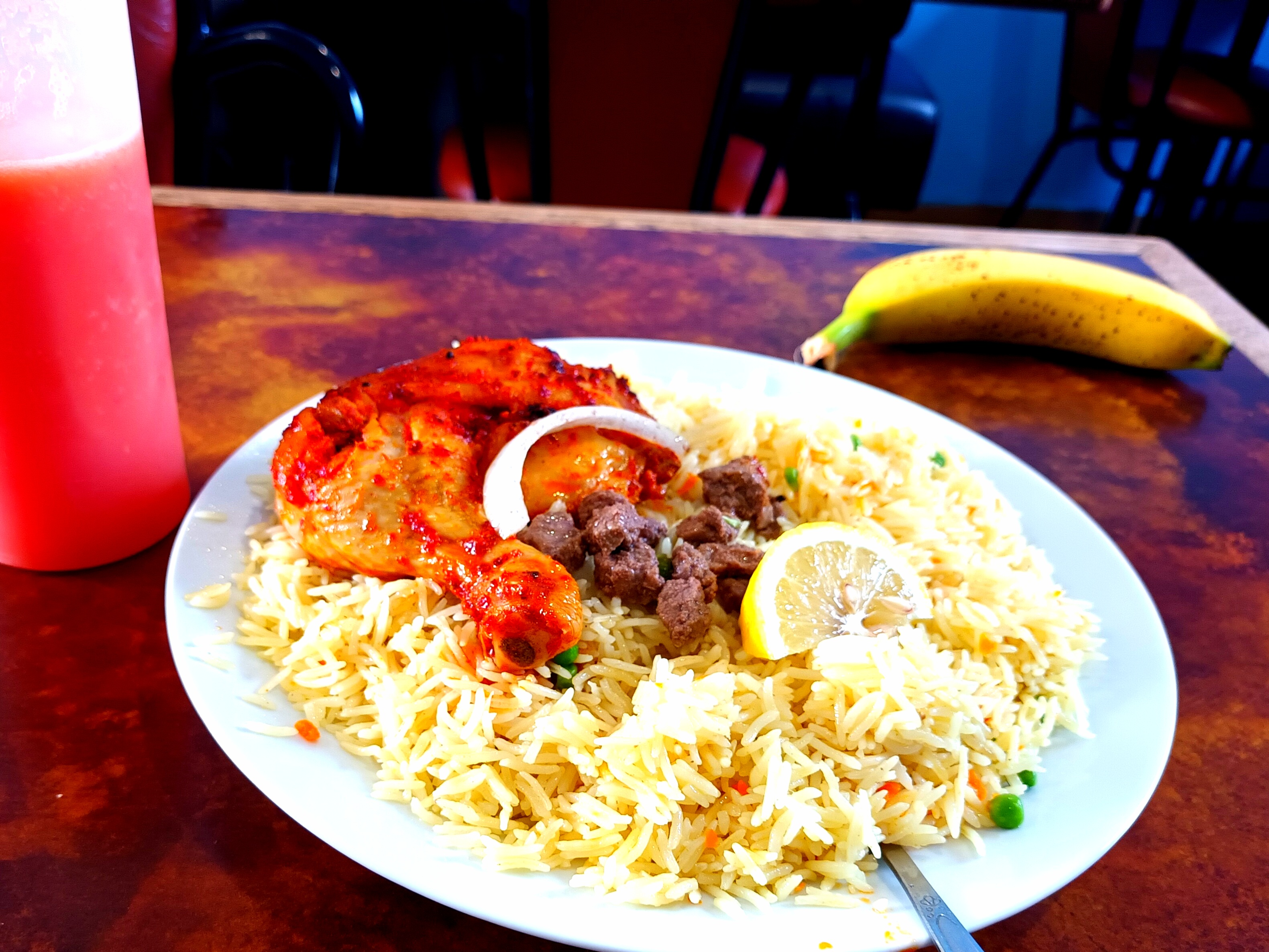 A pleasant experience eating in this simple, low-cost Somali place, there are several stews, but due to lack of knowledge we ordered Chicken with Rice for the photos!! Simple, exquisite Chicken! Very well seasoned and cooked, it gets rid of the bone, just by dropping your spoon, it is accompanied by a very, very generous portion of rice, about 350 grams! A slices of yellow lemon and they have a spicy sauce, which when combined, gives it the last touch, so that you eat Very Tasty and be satisfied for only 6 Euros!!