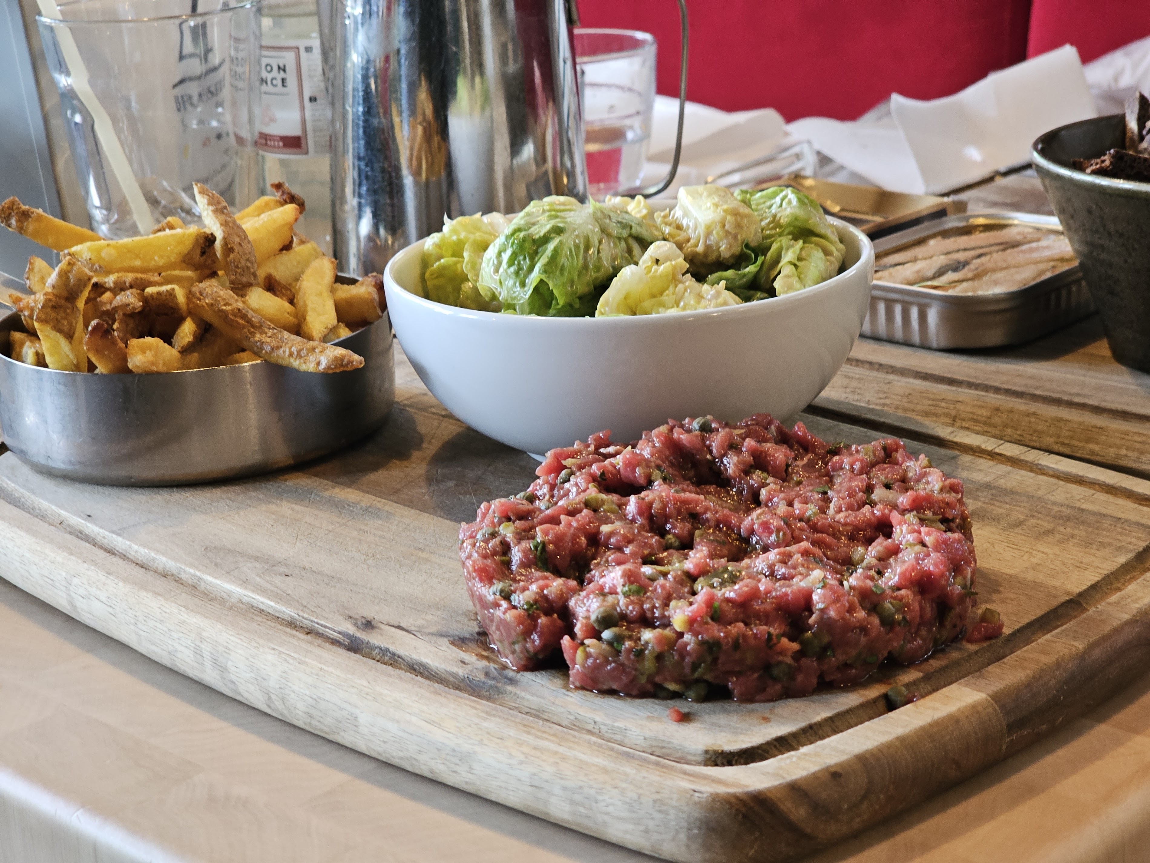 Just outside the walls of Carcasonne… a quiet brasserie with seating indoor and outdoor. The food was quite pricy for what you get. We liked the fried egg starter and the tomato burata, but to ask over 10 euros for raw vegetables is a bit too much… we were not told it was just raw vegetables and expected something fried… as for the main course we liked the tuna steak. But the linguine with clams was disappointing… it tasted well, but we only found 8 clam meat in a plate worth of 26 euros… when telling the waiter, he left with our comment but we heard nothing back from it. Also the risotto was a bit too chewy for our taste. Service lacking, price too steep for the quality you get… if prices were more decent it could be an ok place to go for.
