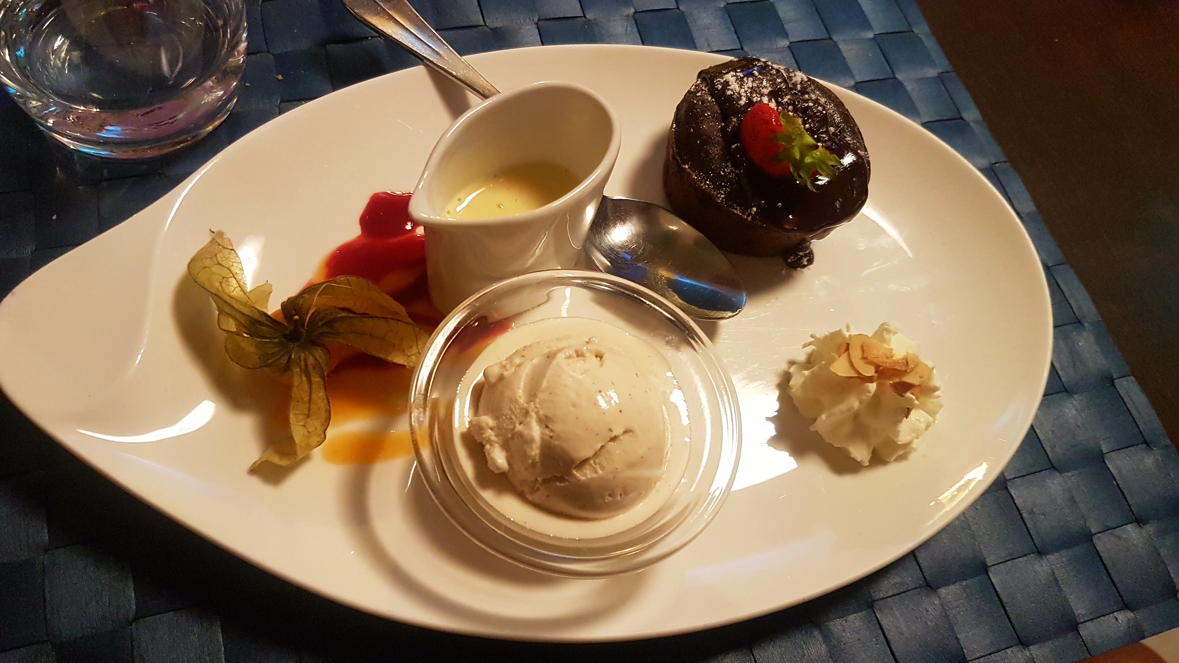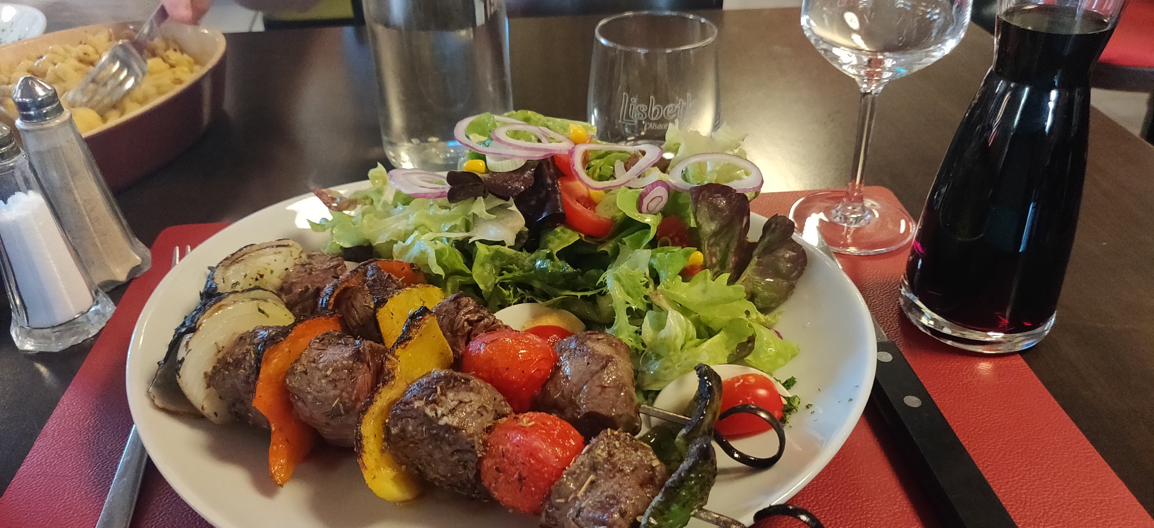 Good food. Salad with chicken, French "pizza", and local wine are very good. They made accomodations to make some dishes vegetarian. Good prices. Very pleasant staff. Recommended.