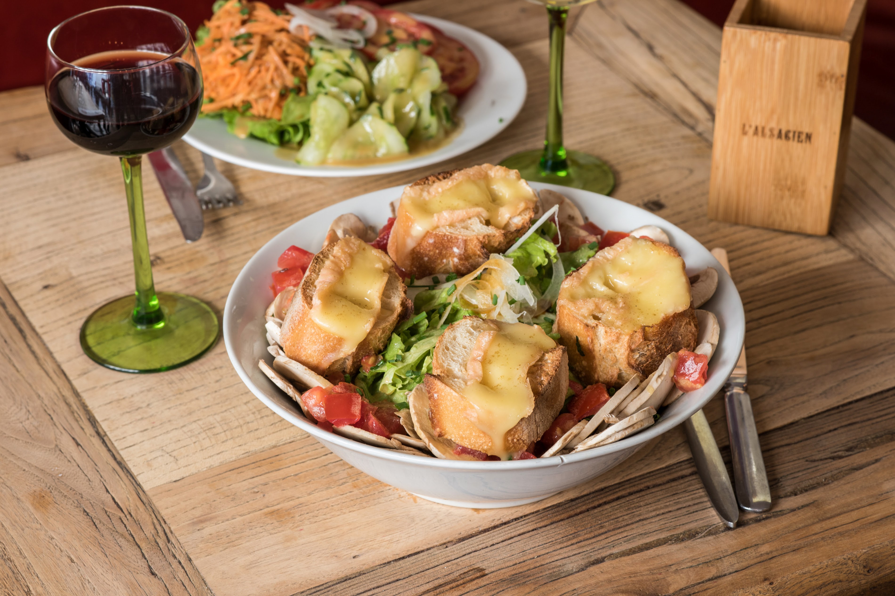 Excellent Flammkuchen with a green salad, with Crémant (bubbly wine) as a drink (€6). Interesting wine list.