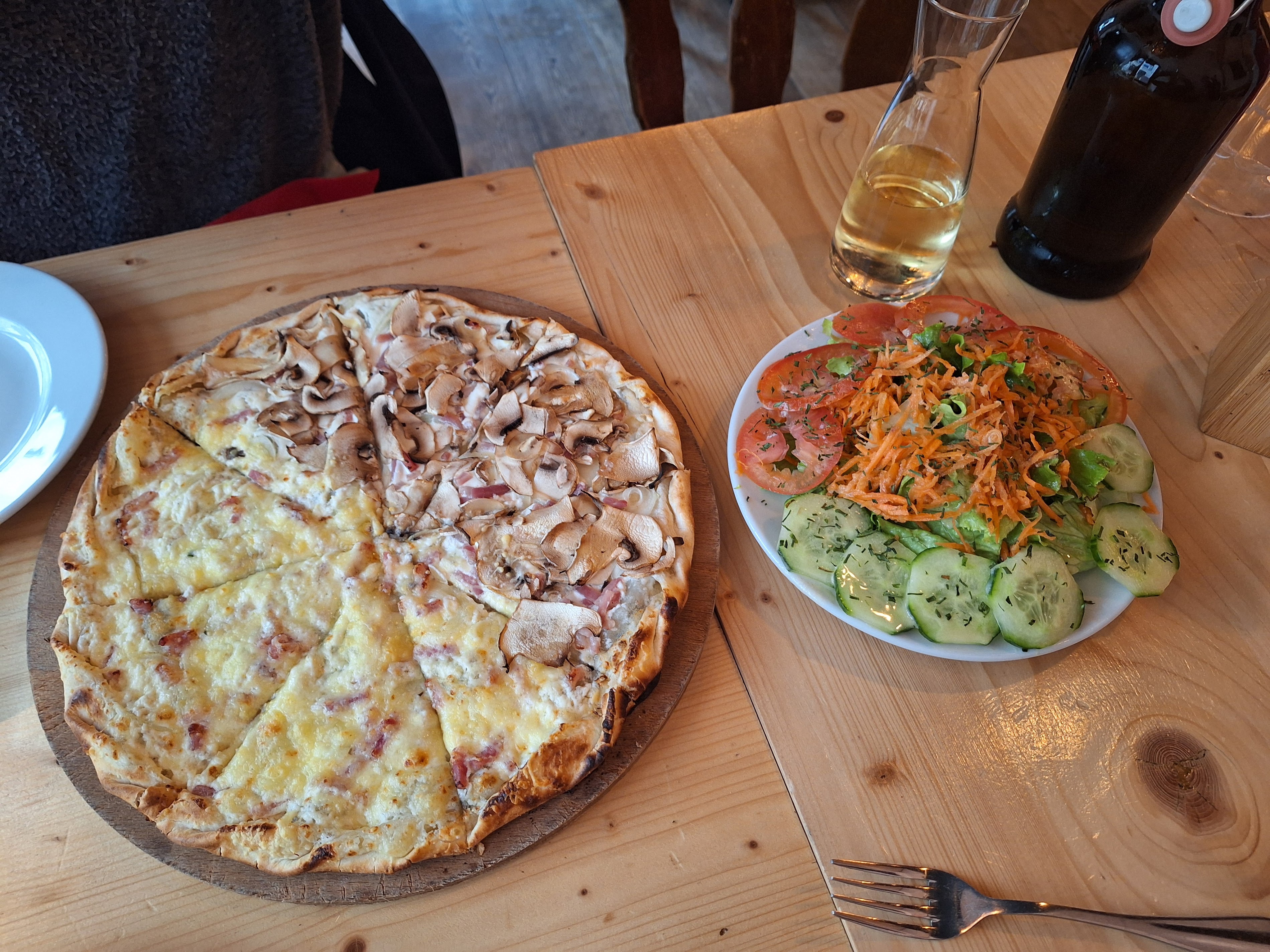 One vegan savory flammekuech, with mushrooms, onions, vegan cream and lardons végétaux. Overall it was nice, the lardons were tasty and smoky (which probably make it feel similar to the original) and the soy cream was good, but there was indeed too little of this cream and some parts of the dish felt too dry because of it. More cream would definitely improve the dish, as well some more ingredients (vegetables and sauces) to make it richer.