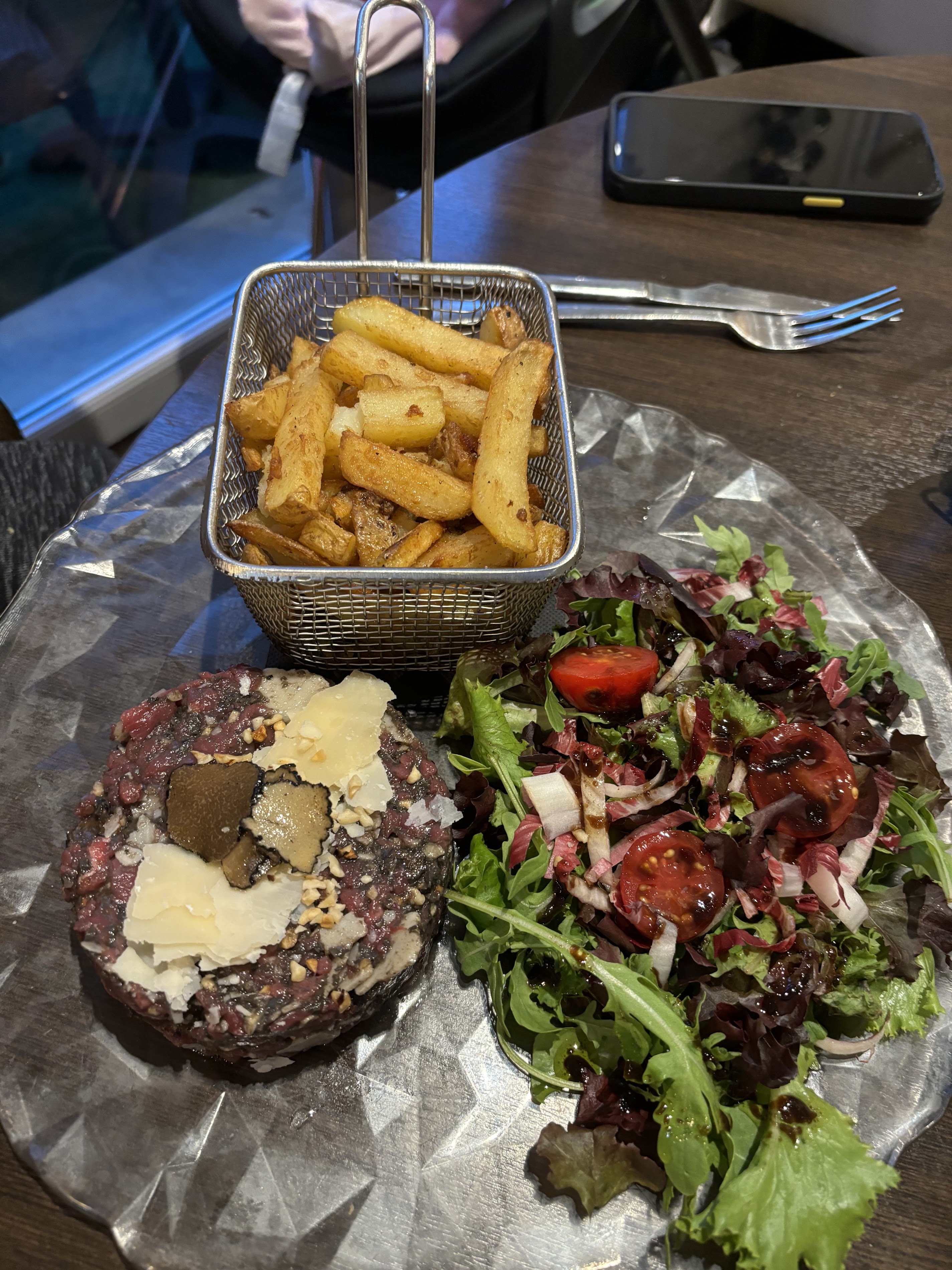 Nice waiter. Huge room with almost no guests. We had chicken and lamb - it was ok - no more than that. But the French fries! Probably the worst ones I have ever tasted in my life! Completely soggy - inedible! Same with the vegetables we ordered on the side.