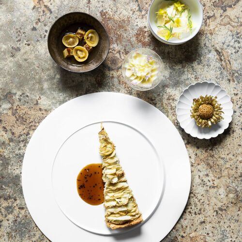 Argentine chef Mauro Colagreco has taken up residence on the Italian border, between the mountains and the sea, in a restaurant boasting mesmerising views of the Mediterranean. His culinary creations now reflect the lunar calendar, with ingredients being gathered and dishes being concocted in accordance with the phases of the moon – an ancient practice revived by followers of biodynamic agriculture. He harvests his plants at peak ripeness to create daily alternating set menus based on realms of nature such as "flowers", "fruit", "leaves" and "roots". This exacting philosophy allows the chef to get the very best from his vast vegetable gardens, as well as from his hand-picked supply of fish, shellfish and meat. Delivered by a talented kitchen team, his cuisine is in no danger of falling into routine. As technically flawless as the dishes may be, they remain thoroughly accessible, prioritising flavours that are combined in perfect harmony.