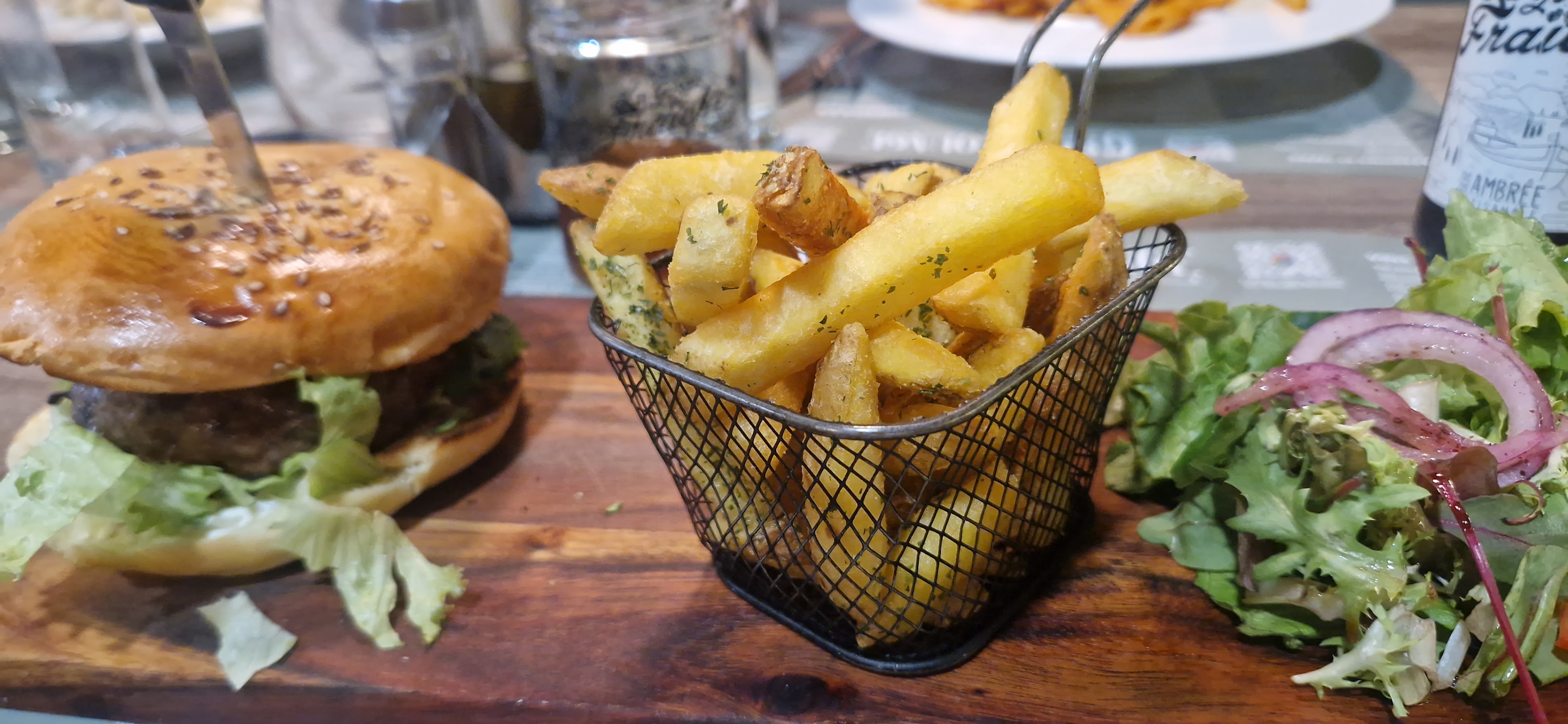 I had the juicy burger and fries. It is a double burger, perfectly cooked and delicious!! Sorry I didn't get a picture before smashing it and having a bite! I was starving!