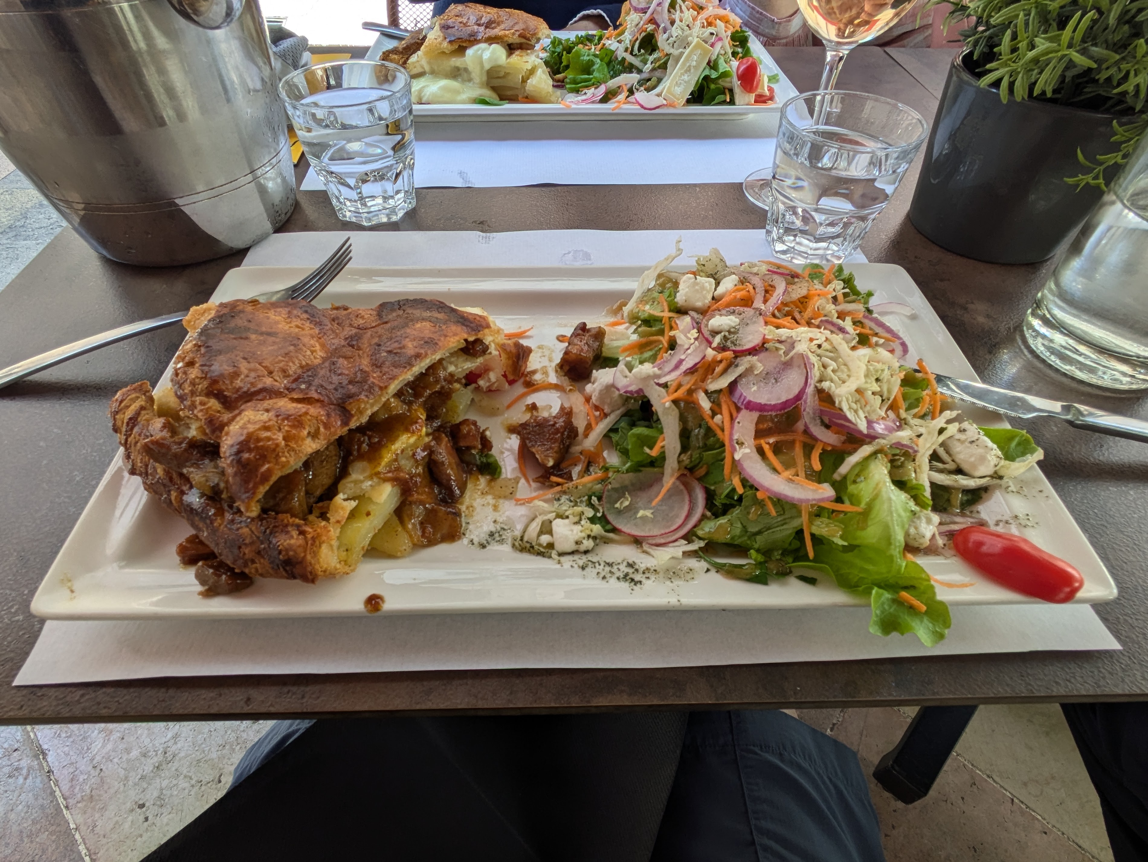 (Chicken thigh stuffed with scarmoza and basil, polenta and zucchini). They thoroughly enjoyed it. The remainder of our group enjoyed Les Pat à Coco, a specialty of the restaurant. It is a potato pie, with crispy, flaky pastry and you can choose from a variety of additional layers within that might include roasted vegetables, tapenade, goats cheese, bacon, caramelised lamb…there were many options. This came with a generous and nourishing salad. Coupled with a rosè and followed by coffee and a range of sumptuous desserts this was a devine lunch made only better by warm service and, of course, outstanding company. If the weather is good I recommend eating outside like we did. A perfect lunch!