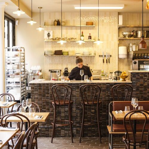 Come in from the cold of rue du Pôle-Nord ("North Pole Street") – a warm welcome awaits you, courtesy of chef Philippine Jaillet and her partner Charles Neyers. Their restaurant with an open kitchen, brass counter and Thonet chairs has all the trappings of a typical Parisian bistro. When it comes to food, they use good fresh ingredients in keeping with the seasons to fashion contemporary creations with an innovative and quirky touch, as seen in the mushroom chawanmushi (a Japanese egg custard dish without milk or sugar, normally prepared with dashi), cep praline, pickles and grilled mushrooms, or vegetarian pithiviers with celeriac. Very reasonably priced lunch menu.