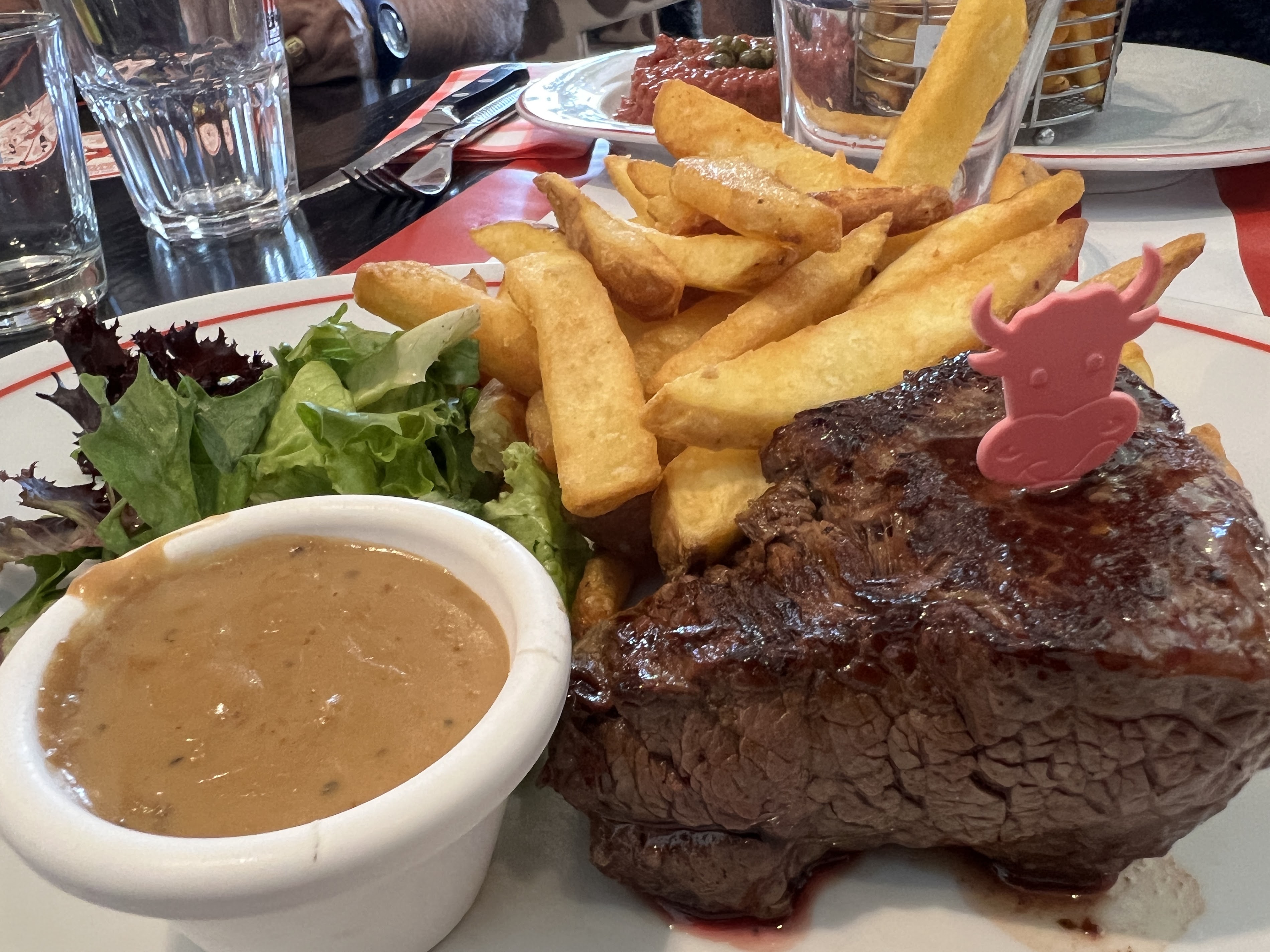 Visited for dinner as a party of 8 while staying in the B&B hotel nearby. Arrived at opening time 18.45 and were welcomed in by the Manager. Nice seating available inside and outdoors, we sat inside. Staff friendly but limited English so stretched our french skills. Drinks and food ordered and came out in good time. Food was okay and good portions. Large menu and good choices avaliable