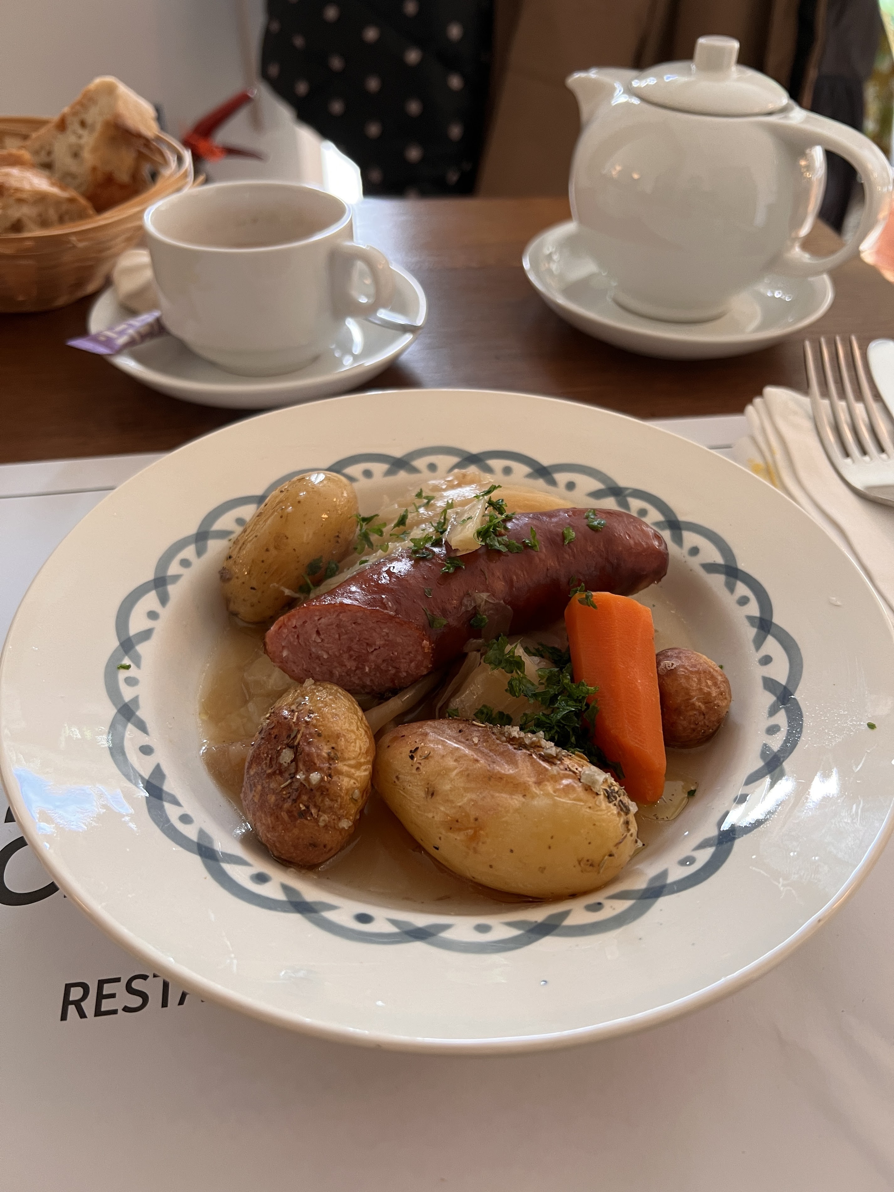 Plat de jour, poulet. Rice a little crispy (not cooked thoroughly), sauce over salted. It was nice that the proprietor seated us for lunch, as he was closing. Chocolate cake just ok. The chocolate cake I had at Versailles cafe yesterday was superb! Oh, the Côtes du Rhône was sub par…