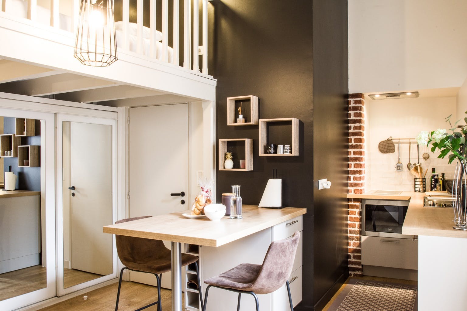 - • This home is spread across two levels, with the bedroom located on a mezzanine floor