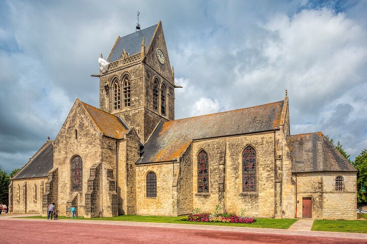 Pause in the famous Airborne town to see the church’s stained-glass paratroopers and the effigy recalling the “Longest Day” story. Time for lunch at a café or bakery (own expense) and a quick browse of the Airborne Museum gift shop if desired.