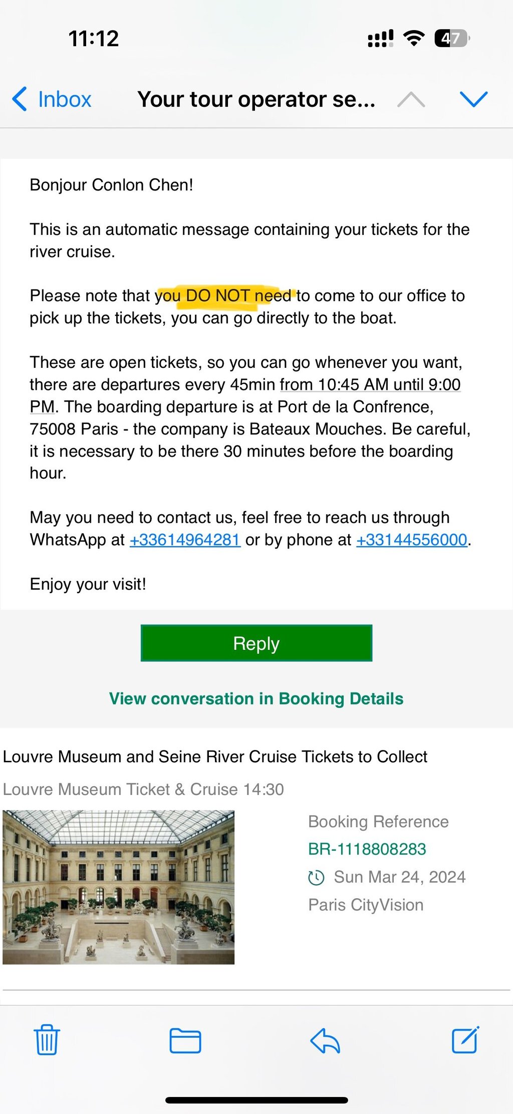 Had a bit of confusion receiving tix but was resolved quickly by organizer. No fault to them .. jus email issue. Great (long) day at the Louvre otherwise. Would recommend to avoid long lineups to purchase tickets on-site.