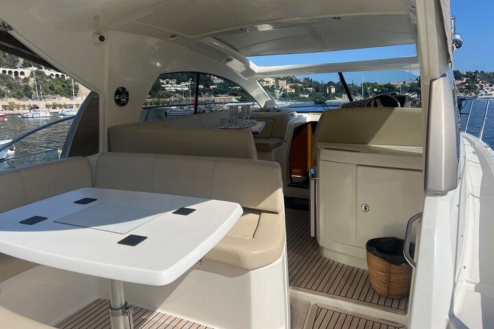 What to Expect - Magical Sceneries -Breathtaking view -Paradisiacal beaches -Crystal clear waters -Naturist tanning allowed in specific locations or during navigation. Enjoy a private yacht at exceptional rates with mooring in beautiful coves, featuring minimal navigation between the port and mooring location. We pick you up at the port of Villefranche-sur-Mer or Port of Nice and we go to the magnificent mooring places. Included services: -Private yacht for 4 hours ( prestige 38S) with professional skipper -Exclusive mooring (breathtaking scenery) -Boarding at port de la santé ( easy access from Nice) or at the port of Nice - Snorkeling gear - Bottle of water -Naturist tanning allowed for heterosexual couple or group -The captain ask to respect the people around the boat when you are naked